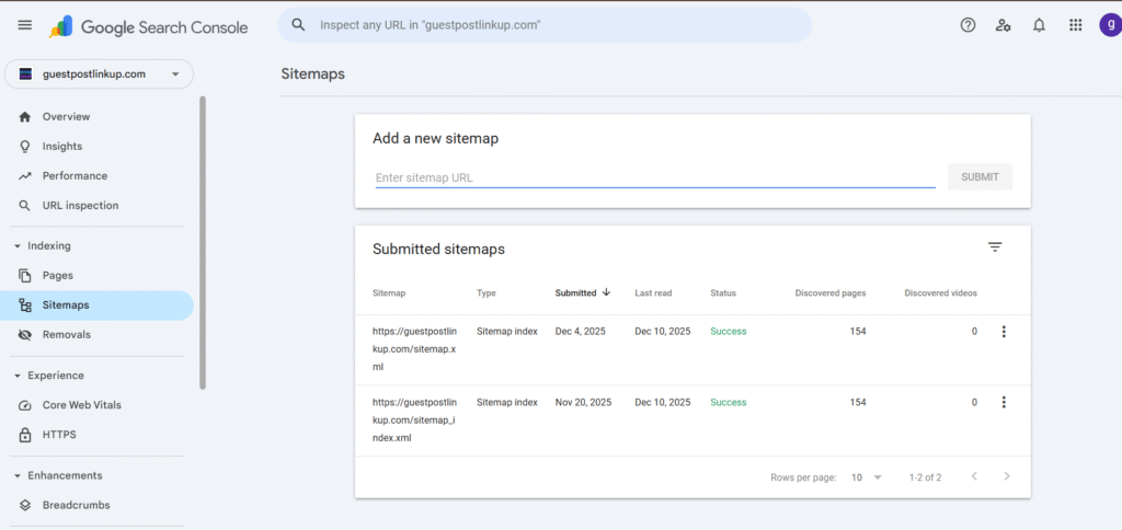 This section helps you submit your website’s sitemap for indexing. You just need to add sitemap.xml to your website’s URL and submit it. If you see “Success,” your sitemap is submitted correctly. But if you see “Couldn’t fetch” or “404 error,” it means there is an issue with your sitemap that needs to be fixed.