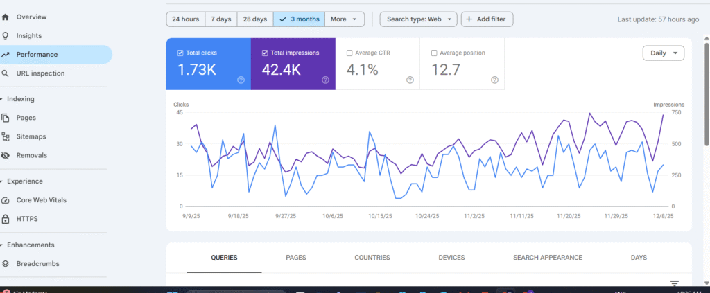 Google Search Console (GSC) is a free tool by Google that helps you track your website’s performance in search. Think of it like a health check dashboard for your website — it shows what keywords you rank for, how many impressions you’re getting, your clicks, indexing issues, 404 errors, and more.