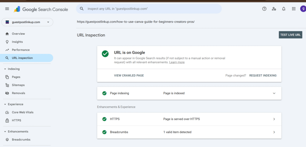 Requesting indexing simply means asking Google’s crawlers to re-check your webpage and re-index it. You can do this through the Request Indexing button inside the URL Inspection tool. The ability to request indexing is an essential part of every good GSC tutorial because it helps you quickly fix issues and push updates faster.