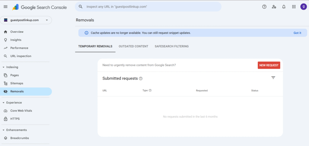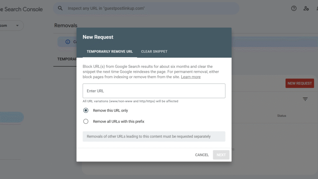 This section is used to temporarily remove 404 error pages from Google’s search results. For example, if you delete any blog or page from your site, it will create a 404 error, which can cause issues in your SEO. To remove that page from Google, simply copy the URL, paste it into the Removal tool, and request removal.