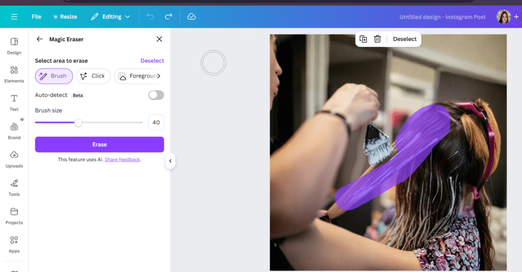 Magic Eraser helps you remove any unwanted object, product, logo, design, or element from your template.