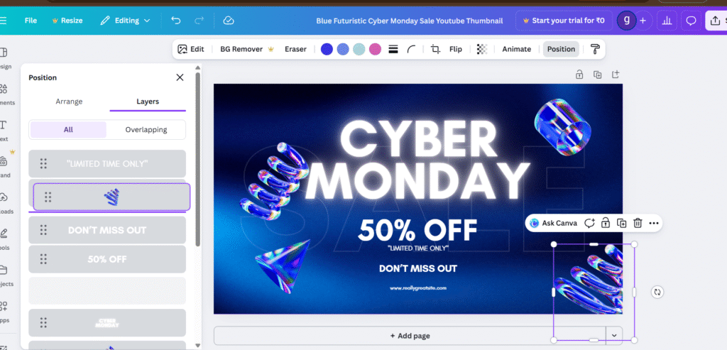 Once your canvas opens, think of it as a ready-to-edit workspace. For example, if you picked a YouTube thumbnail, you can drag your photo, add bold text, adjust the colours, and resize elements with simple dragging. If you picked a Reel template, Canva lets you add vertical videos, apply transitions, include animated text, and decorate with effects and stickers. You’re not starting from scratch — Canva gives you a base, and you just customise it.